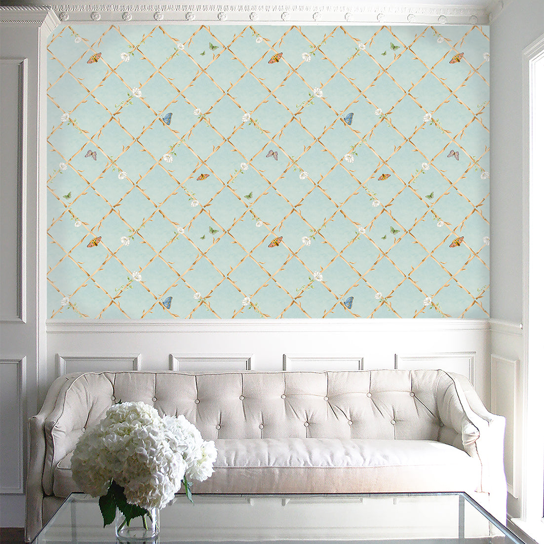 Set in a bamboo trellis butterflies flutter and sore upon a beautiful metallic grasscloth.