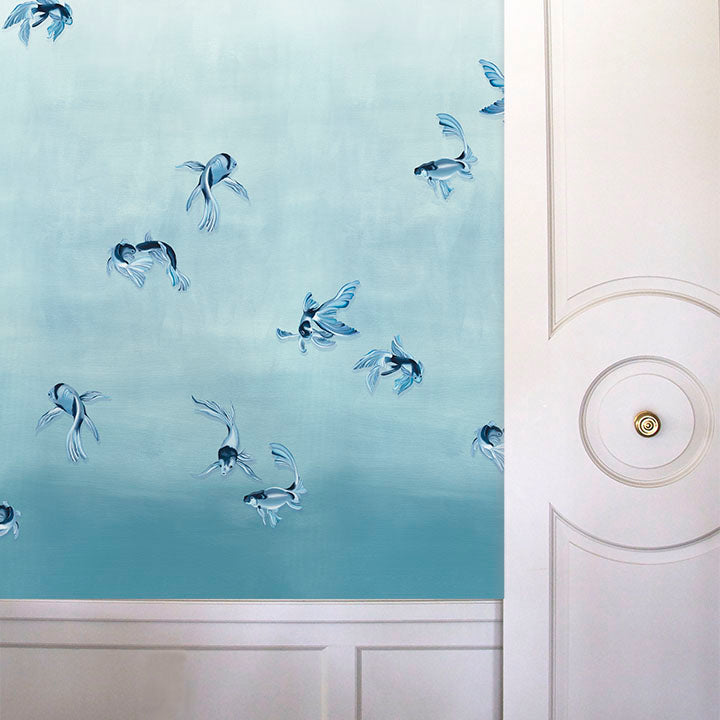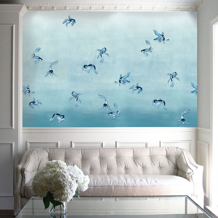 Ann wanted to create a mural that evokes a peaceful feeling. She is attracted to the billowing movement and peaceful gestures of the Koi fish fins underwater, which led her to design the Exhale mural. It is a simple reminder for everyone to breathe. This statement piece is a three-panel mural — grasscloth samples are available upon request.