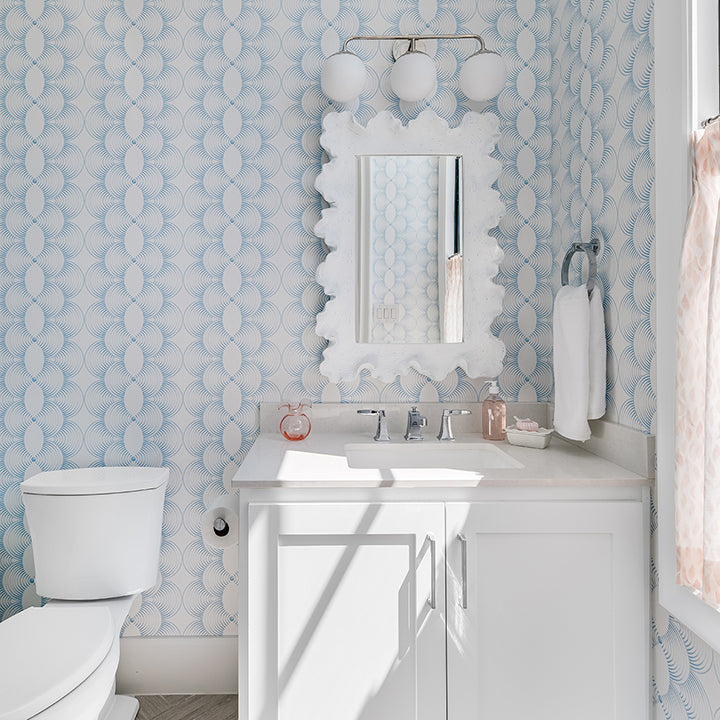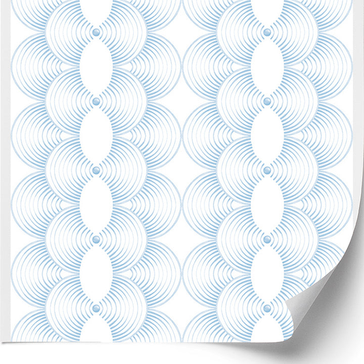 An upward, billowing pattern of uniform arches create a feeling of rhythm and harmony. This transitional design is offered in coastal blue and champagne.