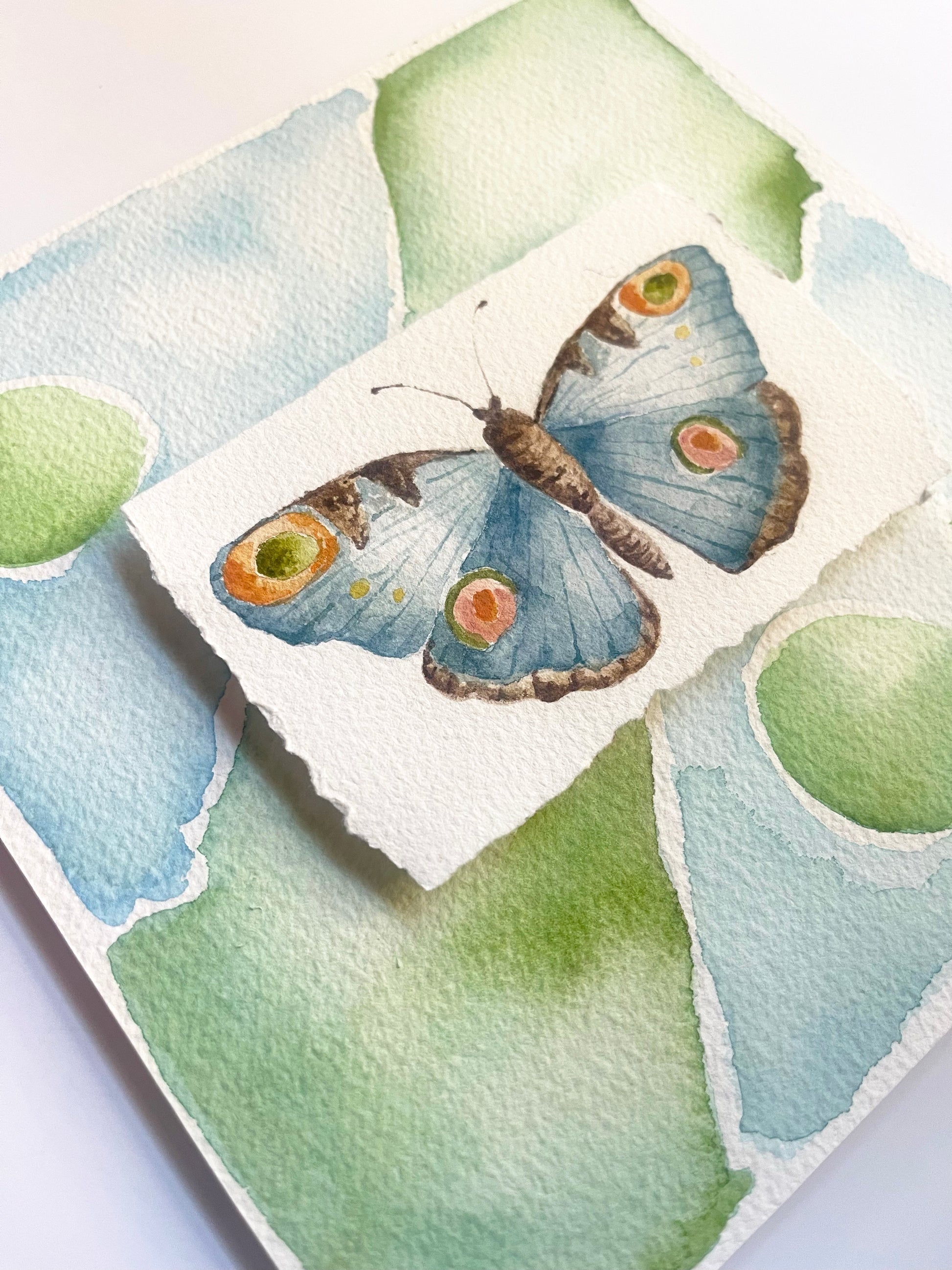 7.5 x 7.5" original watercolor on premium heavyweight paper, mounted on foam board with a second, detailed butterfly watercolor for a layered 3D effect. Great for shadow box display. Art is unframed.